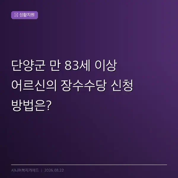 지원 내용과 대상 조건 # 단양군의 장수수당은 관내 주민등록을 두고 실제로 거주하는 만 83세 이상의 어르신을 대상으로 합니다. 지급액은 매월 30,000원이며, 100세 이상의 어르신에게는 월 100,000원이 지급됩니다. 이 제도는 2026년도 적용에 따라, 1942년 12월 31일 이전에 태어난 어르신만 지원을 받을 수 있습니다. 즉, 2026년에는 83세가 되는 어르신, 즉 1943년 생 이상은 지원이 불가능합니다. 신청은 만 83세가 되는 월부터 가능하며, 그 이후 매월 20일에 본인 계좌로 입금됩니다. 이 지원은 상시 신청 가능하므로, 언제든지 방문 신청이 가능합니다.
